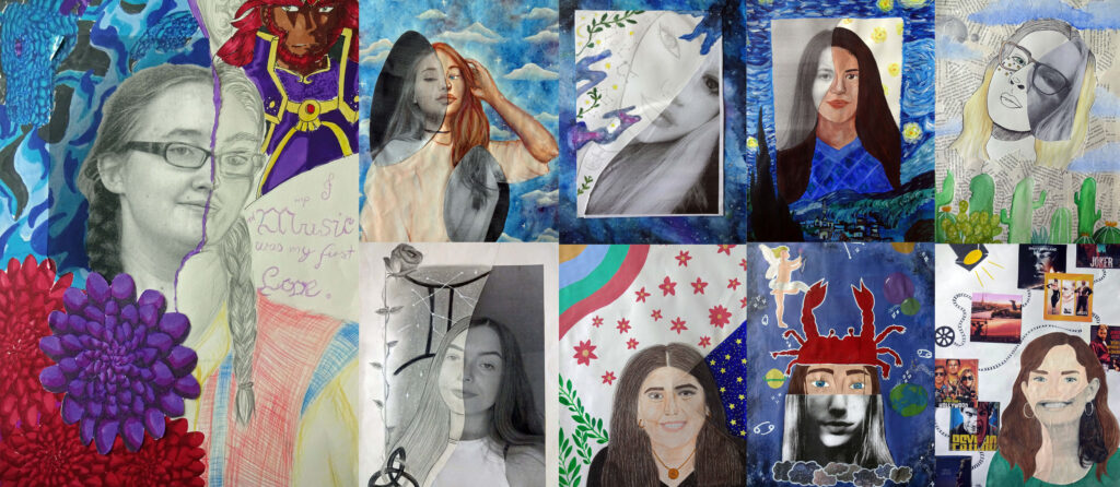 Ausgehend von einem Schwarzweißfotoausschnitt entstanden vor kurzem einige sehr gut gelungene Schülerarbeiten zum Thema „Selbstporträt“. Dabei wurde ein kleiner Teil des Fotoausschnittes in einer Wunschtechnik (z.B. Bleistift, Acrylfarbe oder Kreide) weitergemalt, während der Hintergrund frei nach Lieblingsmotiven, -farben, -formen oder Hobbys gestaltet wurde: