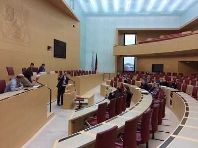 Danach erhielten wir von einem Mitarbeiter des Landtages eine Führung durch die Räumlichkeiten. So erkundeten wir den Senatssaal, der für Empfänge aber auch Veranstaltungen dient und in dem die Entscheidung für das G8 und G9 gefällt wurde. Auch das Konferenzzimmer und den Lesesaal haben wir genauer betrachtet. Anschließend ging es in den Plenarsaal.